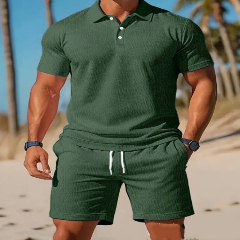 Men’s Casual Beach Mesh Lapel Set Summer Comfortable Breathable Loose Solid-Color Sports Short-Sleeved Shirt And Shorts Set